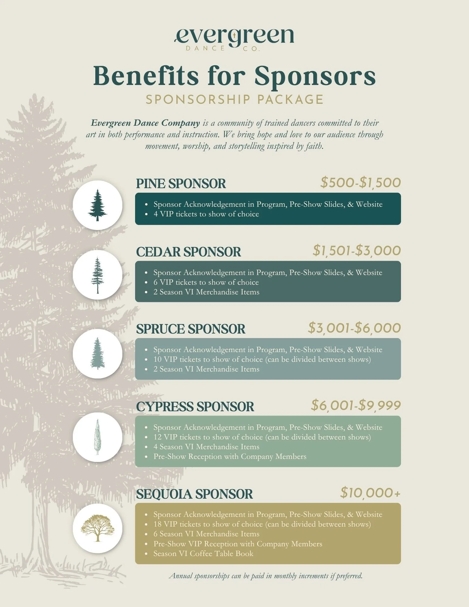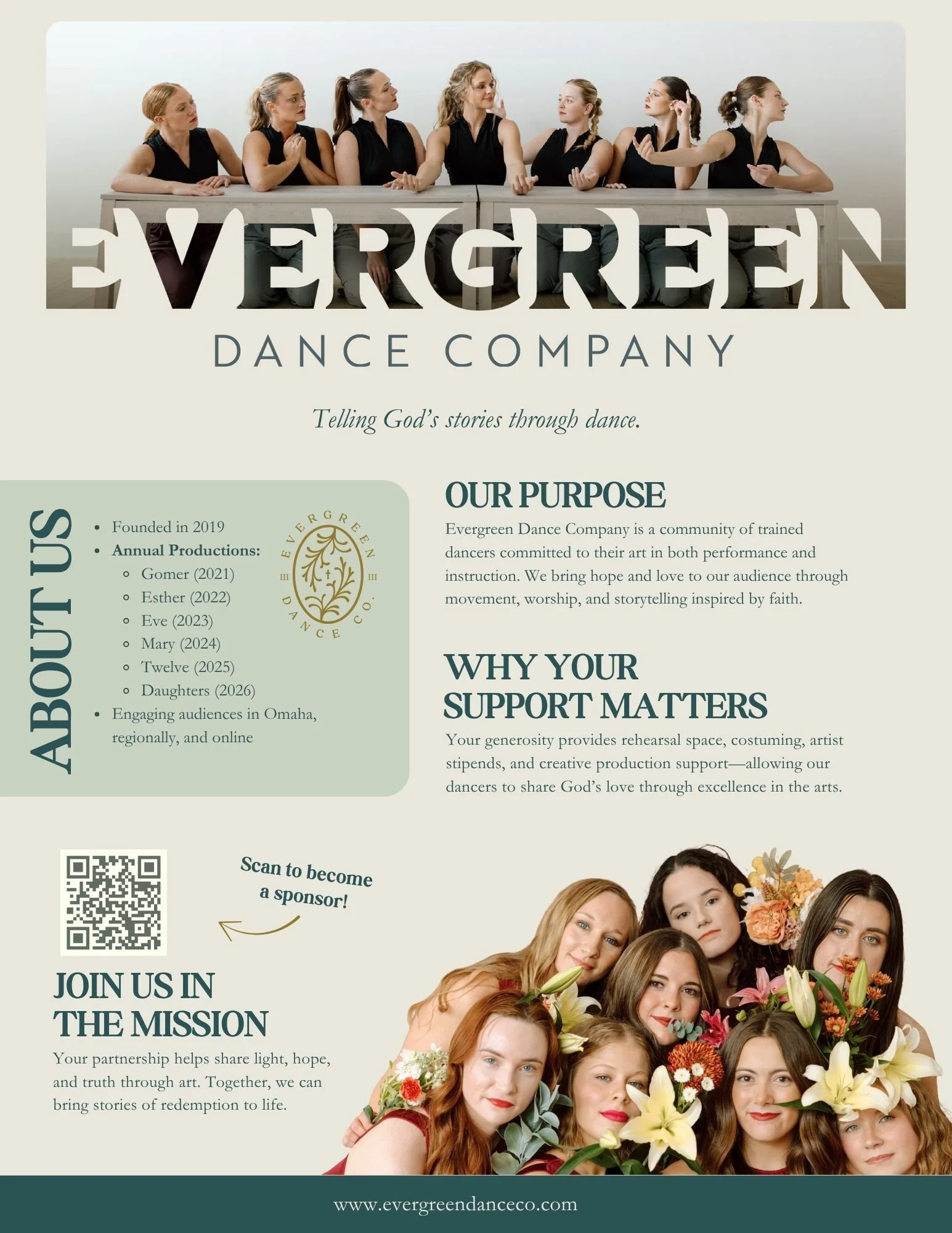 Evergreen Dance Company is a nonprofit organization based in Omaha, NE, comprised of trained dancers who create an original production each year based on a story from the Bible. While their overall branding needs to remain consistent, each year’s performance requires a brand new visual camp